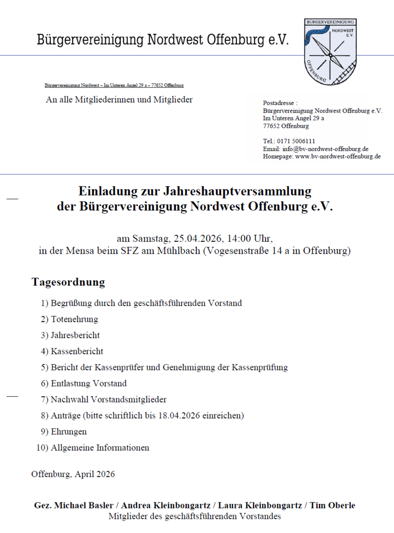 Die Jahreshauptversammlung findet am Samstag 25.04.2026 um 14:00 Uhr in der Mensa beim Stadtteil- und Familienzentrum am Mühlbach (Vogesenstraße 14 a in Offenburg) statt.